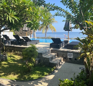 Très beau petit hôtel les pieds dans le sable, les chambres sont spacieuses, il doit y avoir une quinzaine de chambres. Le petit déjeuner se prend au bord du sable et de la piscine. Le personnel est adorable et très serviable comme d'habitude. L'hôtel se trouve sur la plage principale avec en fond le volcan, des bateaux sur le sable noir qui est très fin, et se trouve près de nombreux restaurants et boutiques, entre 25 et 40€ la nuit : Booking Bali Dive Resort Amed